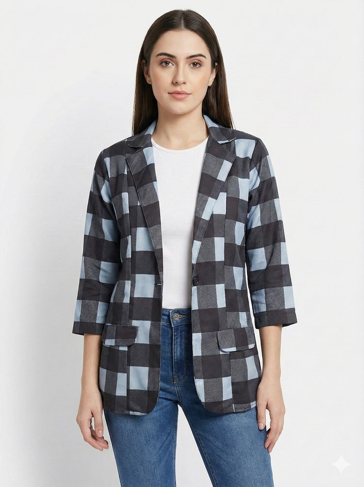 Black & Bluish Grey Checkered All Season Lightweight Women Blazer