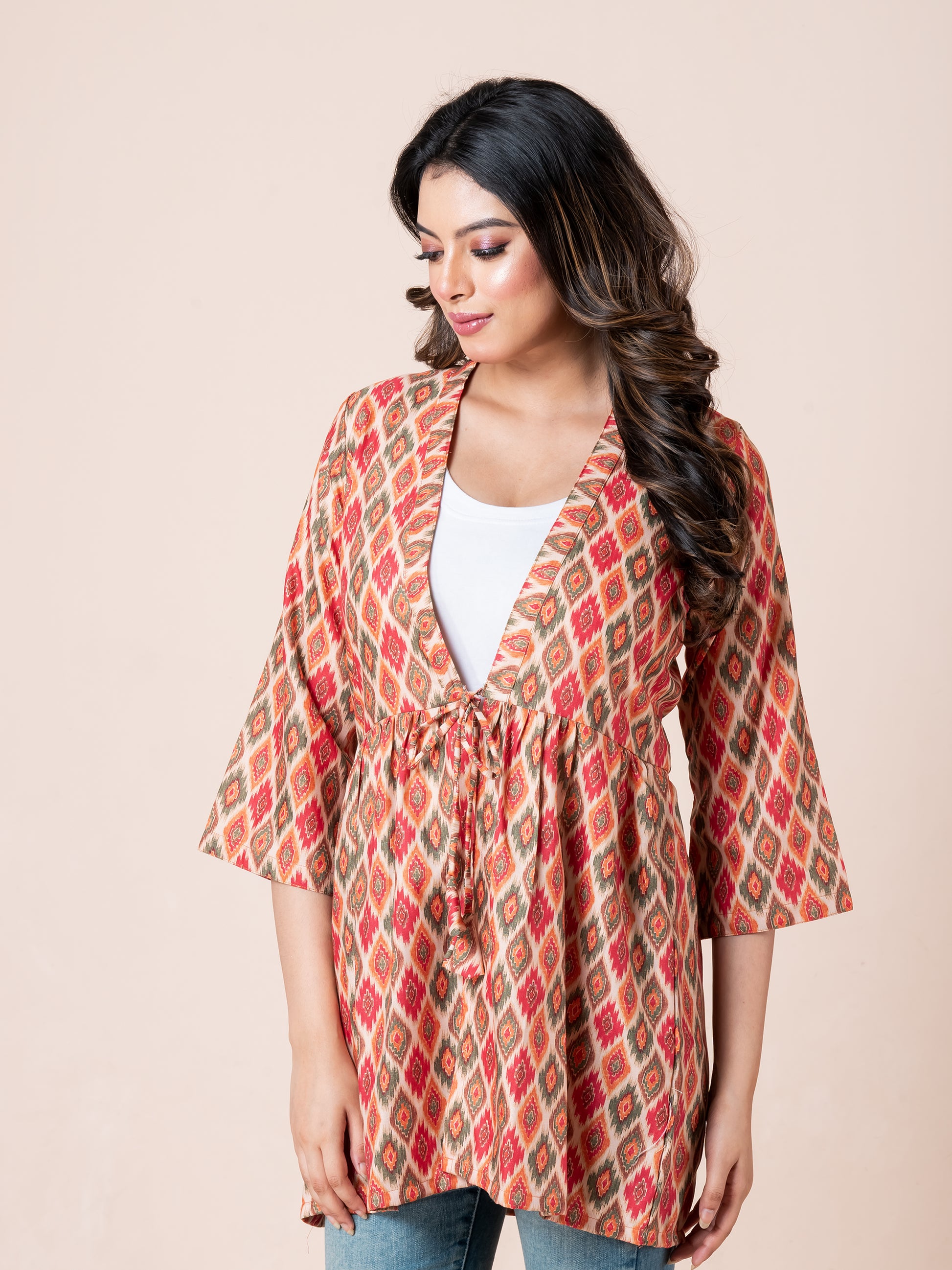 Ikkat Patterns Digital Printed Tie-Up Shrug for Women
