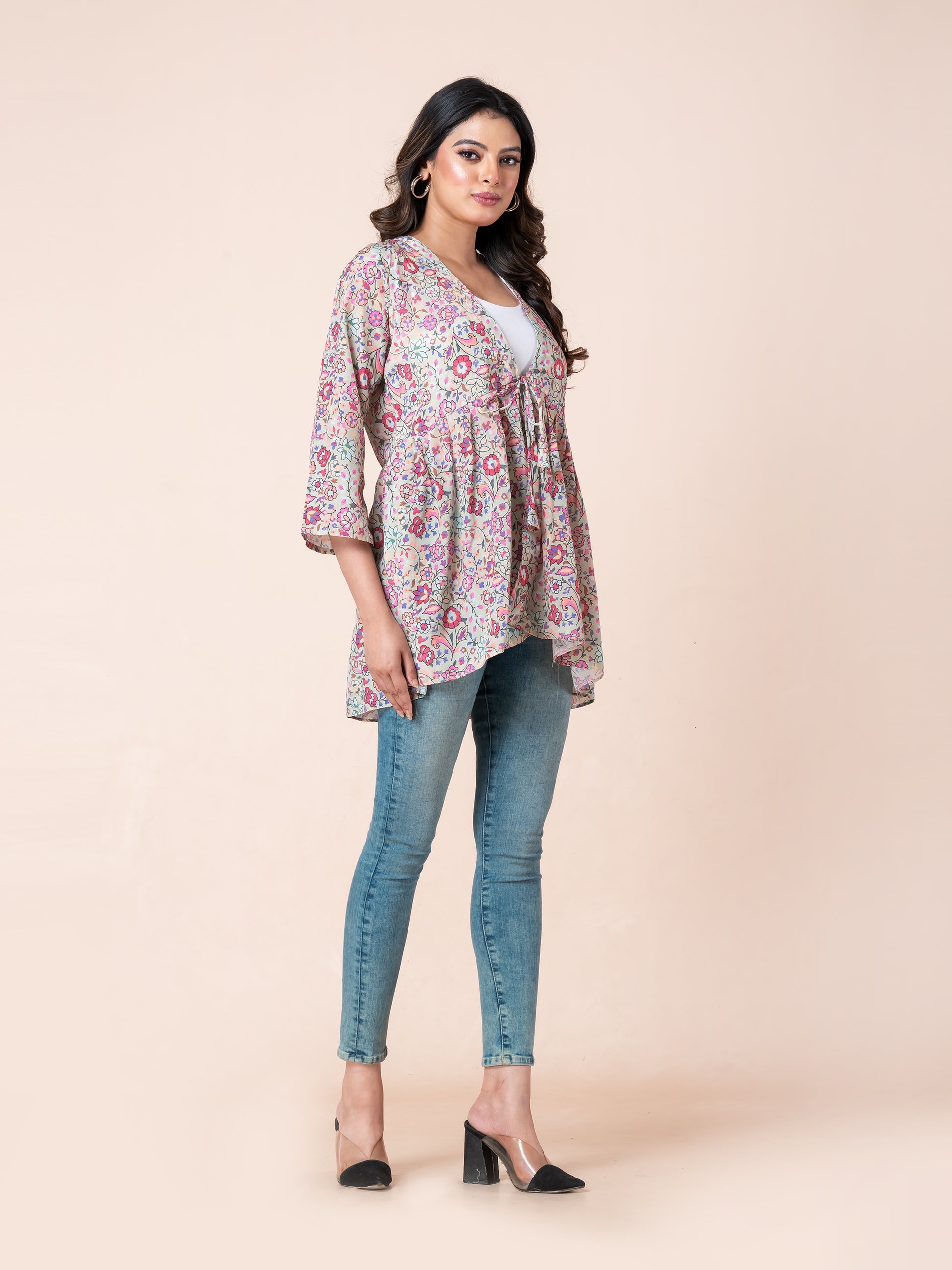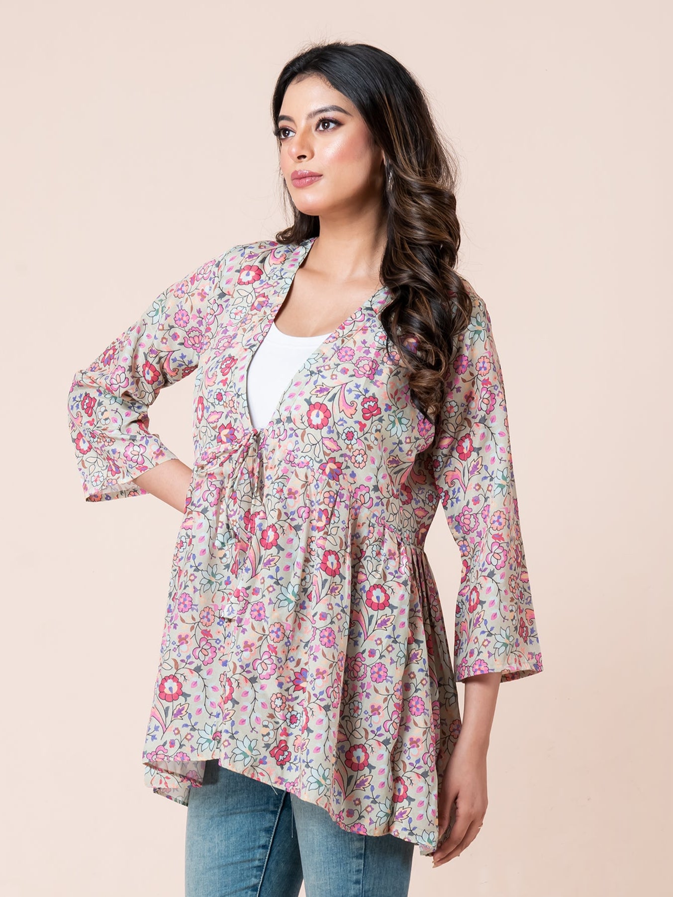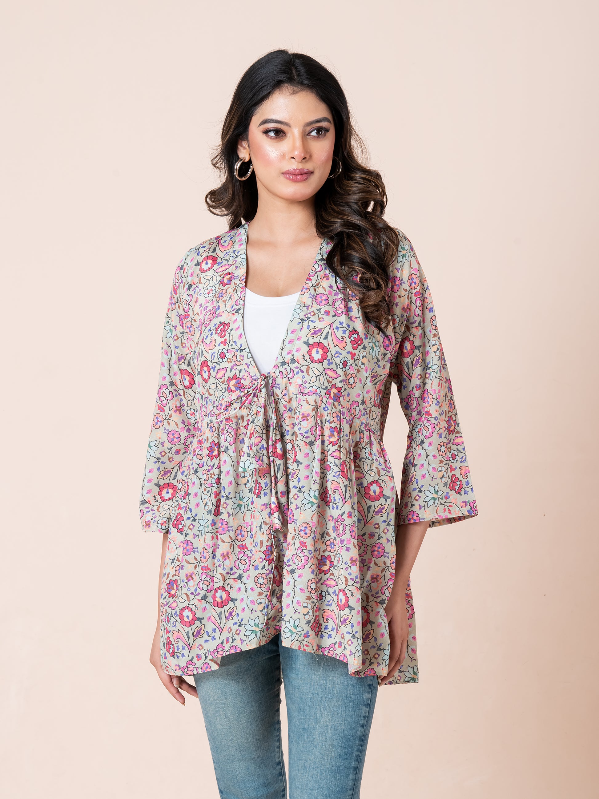 Add a splash of elegance to your wardrobe with our Multicolor Floral Print Tie-Up Short shrug for women, crafted from soft and lightweight French crepe fabric. Set against a beautiful beige background, this stylish shrug top features vibrant floral patterns in shades of pink, orange, purple, green, and white—delivering a sophisticated, eye-catching look. The tie-up shrug design with a charming front open shrug silhouette makes it perfect for layering over camisoles, tank tops, or dresses. Whether you're dressing up for a brunch date, casual outing, or semi-formal event, this piece combines comfort, versatility, and chic appeal in one.