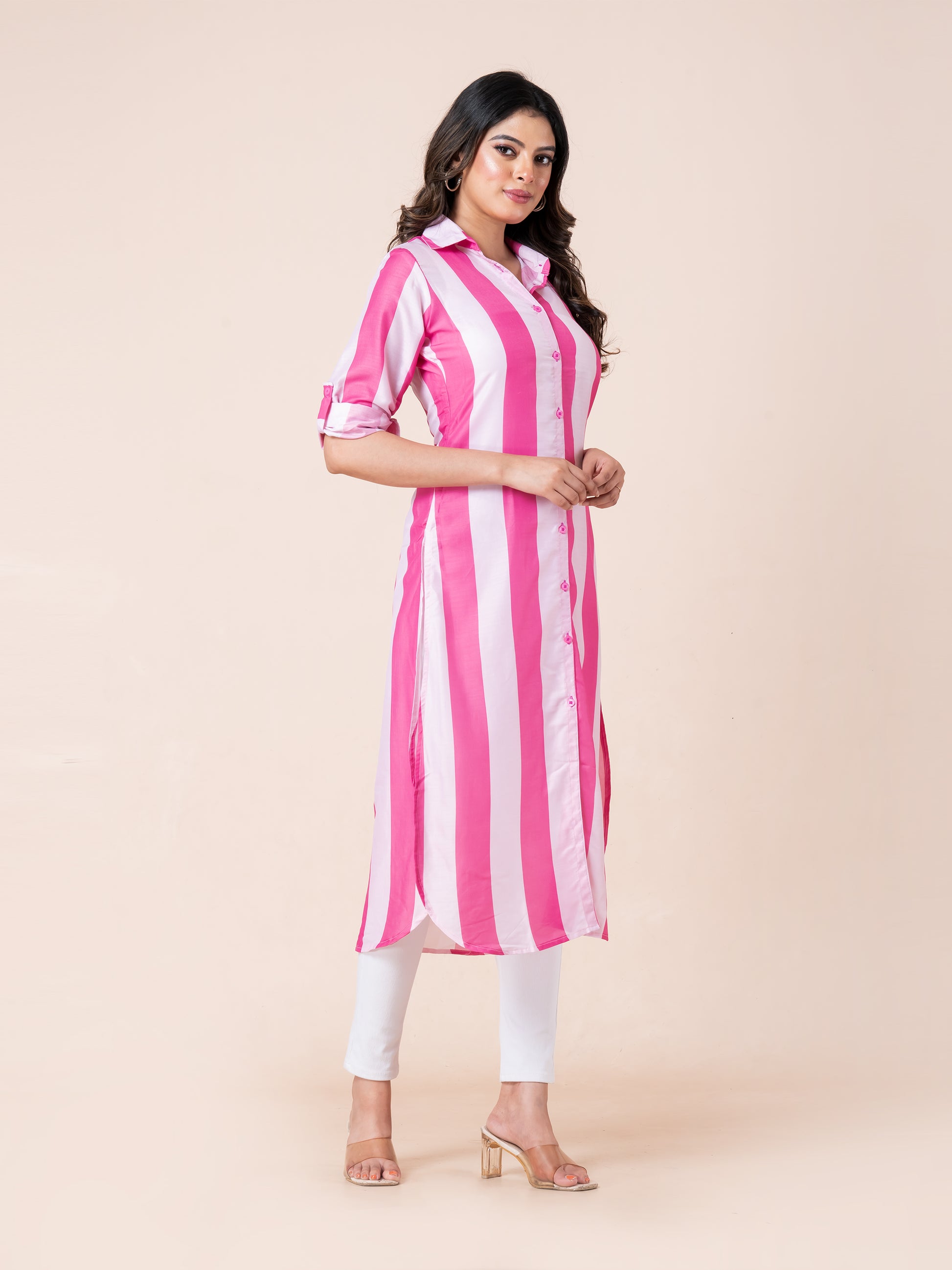 Add a touch of subtle charm to your wardrobe with our Peach and Pink Stripes Digital Printed Long Shirt. Crafted from high-quality poly cotton, this shirt is soft, breathable, and perfect for all-day comfort. The elegant digital print in soothing peach and pink stripes brings a fresh, feminine vibe, making it ideal for both work and casual wear. With its longline silhouette and relaxed fit, this shirt offers a flattering and stylish look that pairs effortlessly with trousers, jeans, or leggings.