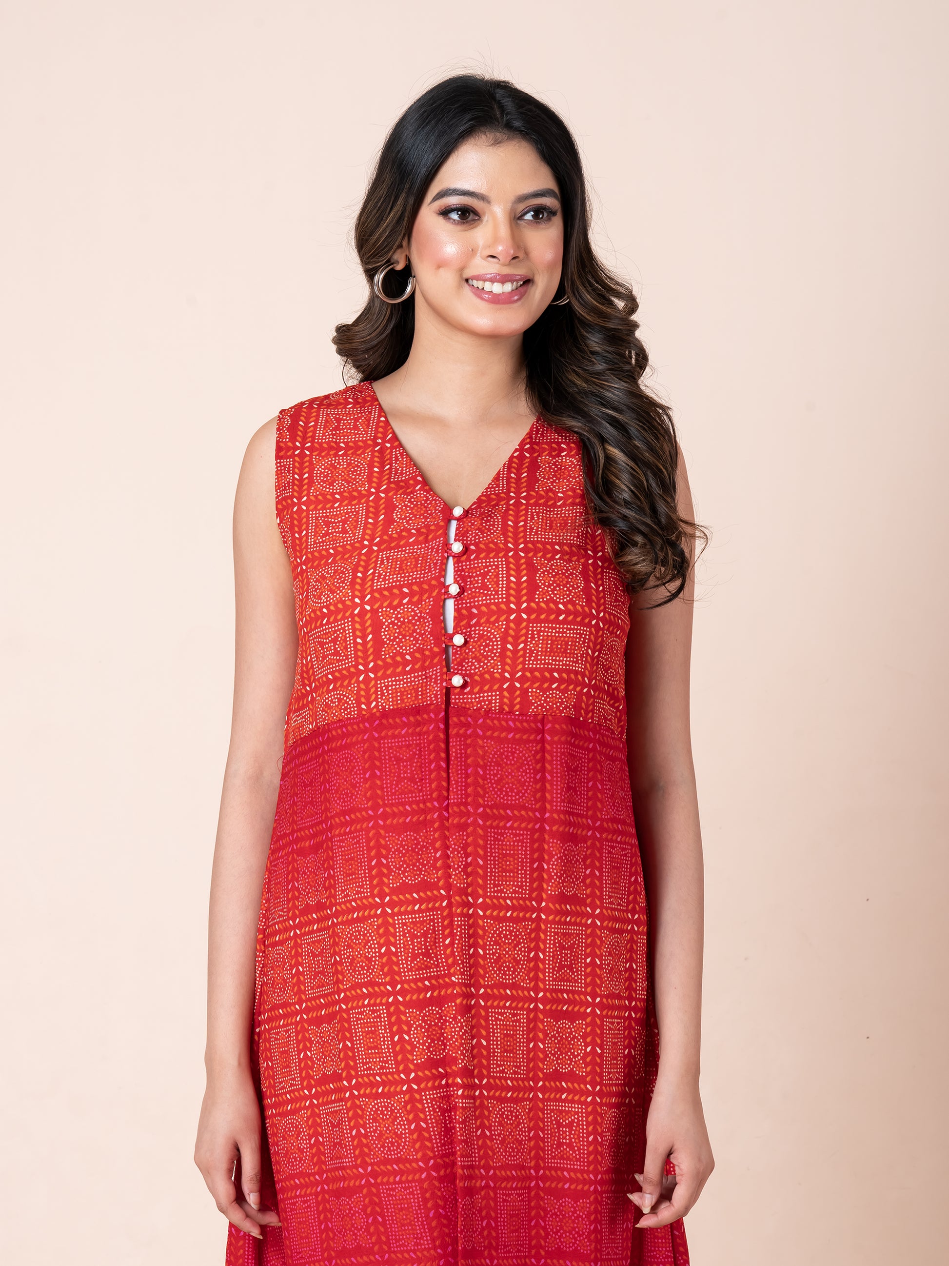Red Bandhini Print Button-up Longline Sleeveless Shrug