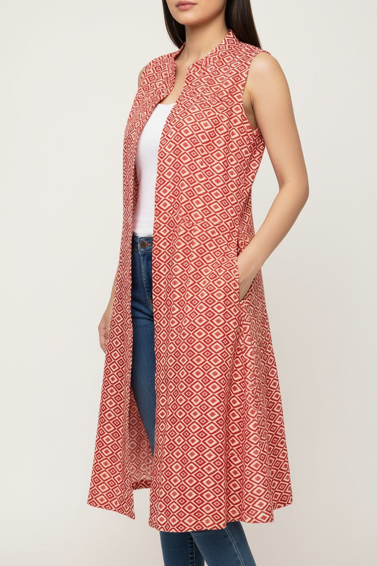 Elevate your everyday wardrobe with our Red Ikat Print Sleeveless Knee-Length Front-Open Shrug, crafted from a breathable cotton fabric. The vivid red Ikat pattern delivers a striking yet timeless appeal, while the sleeveless, knee-length cut and open-front design create a flattering, flowy silhouette that layers effortlessly over dresses, tops, or kurtis. Lightweight and versatile, this shrug is ideal for both casual outings and smart-casual occasions, adding an instant pop of color and artisanal charm to any outfit.