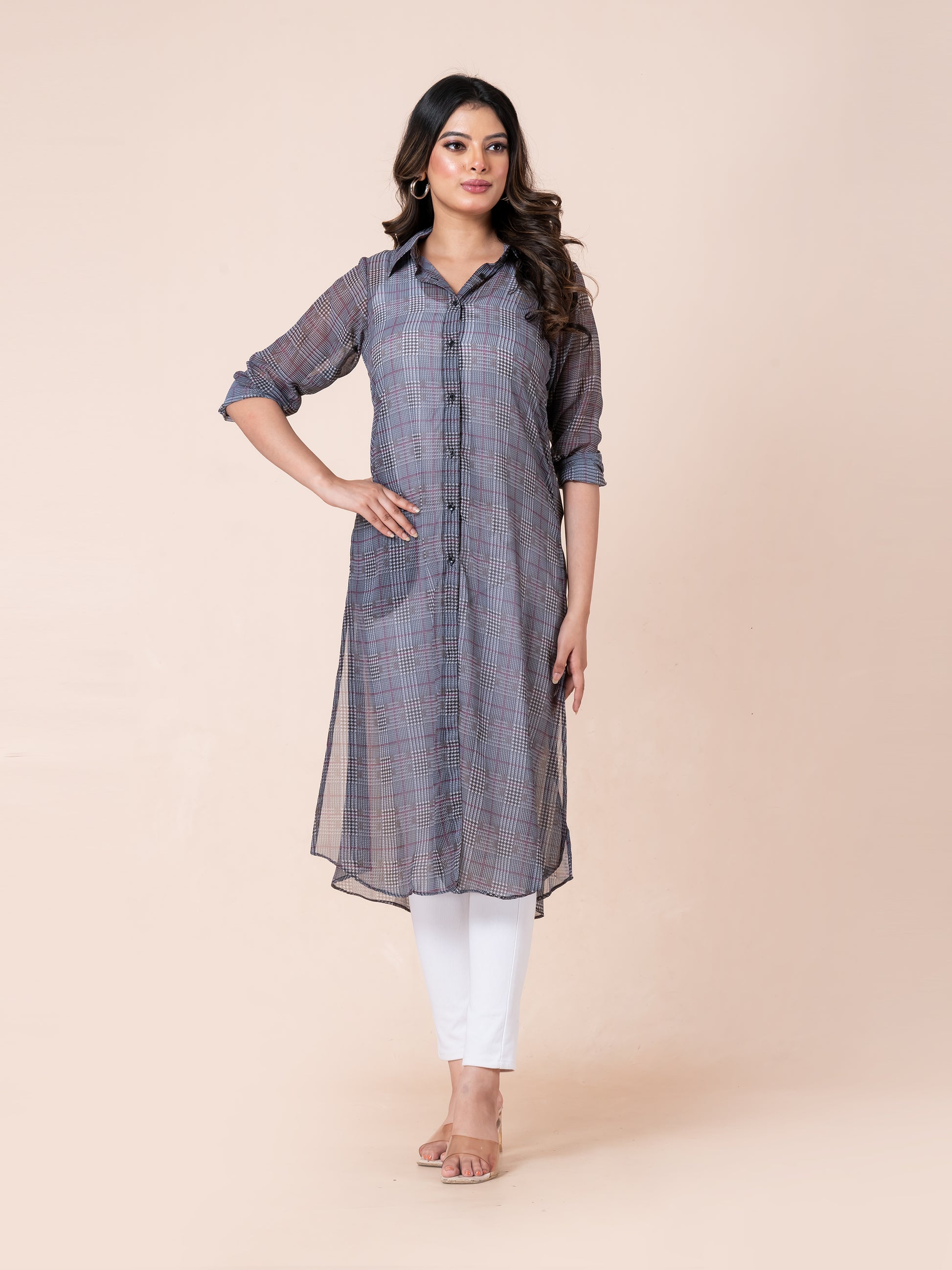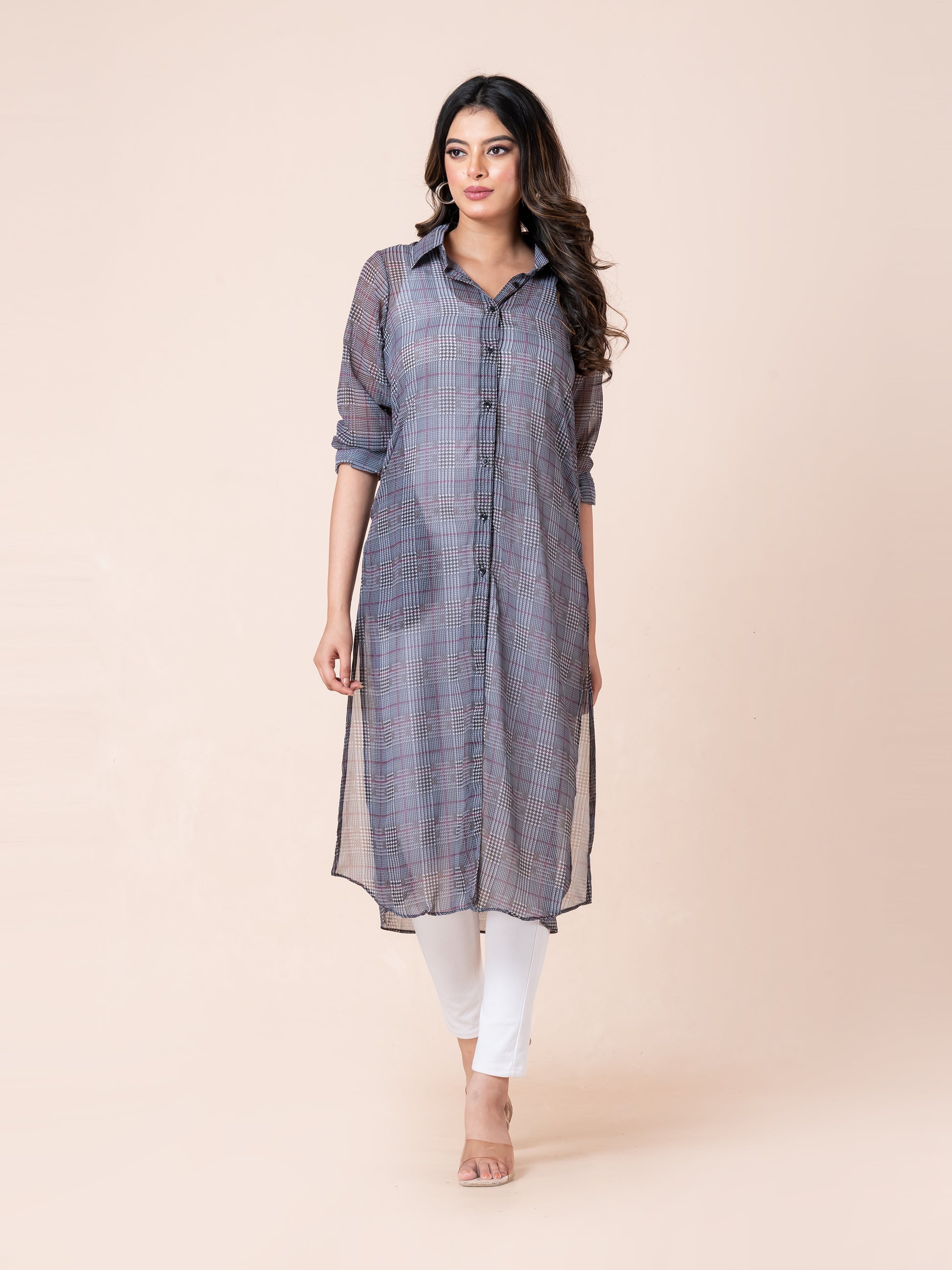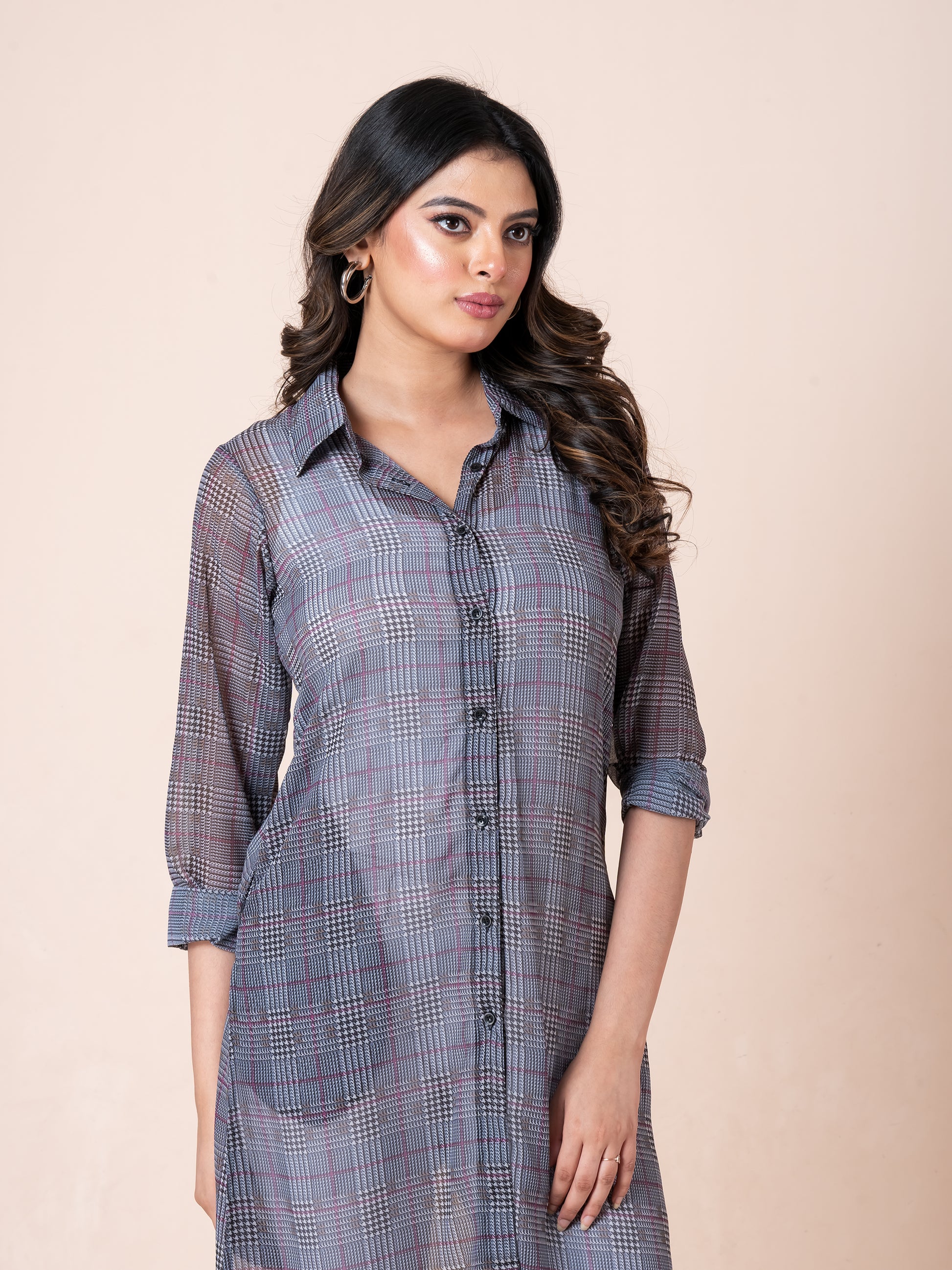 Step into effortless style with our Tiny Strips Glen Checks Digital Printed Long Shirt. Designed to make you look smart and stylish, this long shirt features a modern glen checks pattern with subtle striping for a refined, digital-printed finish. Crafted from a lightweight, semi-sheer fabric, it offers a breezy, elegant silhouette that’s perfect for layering. Whether you're heading to work or enjoying a casual day out, this shirt adds a touch of class and confidence to your look.