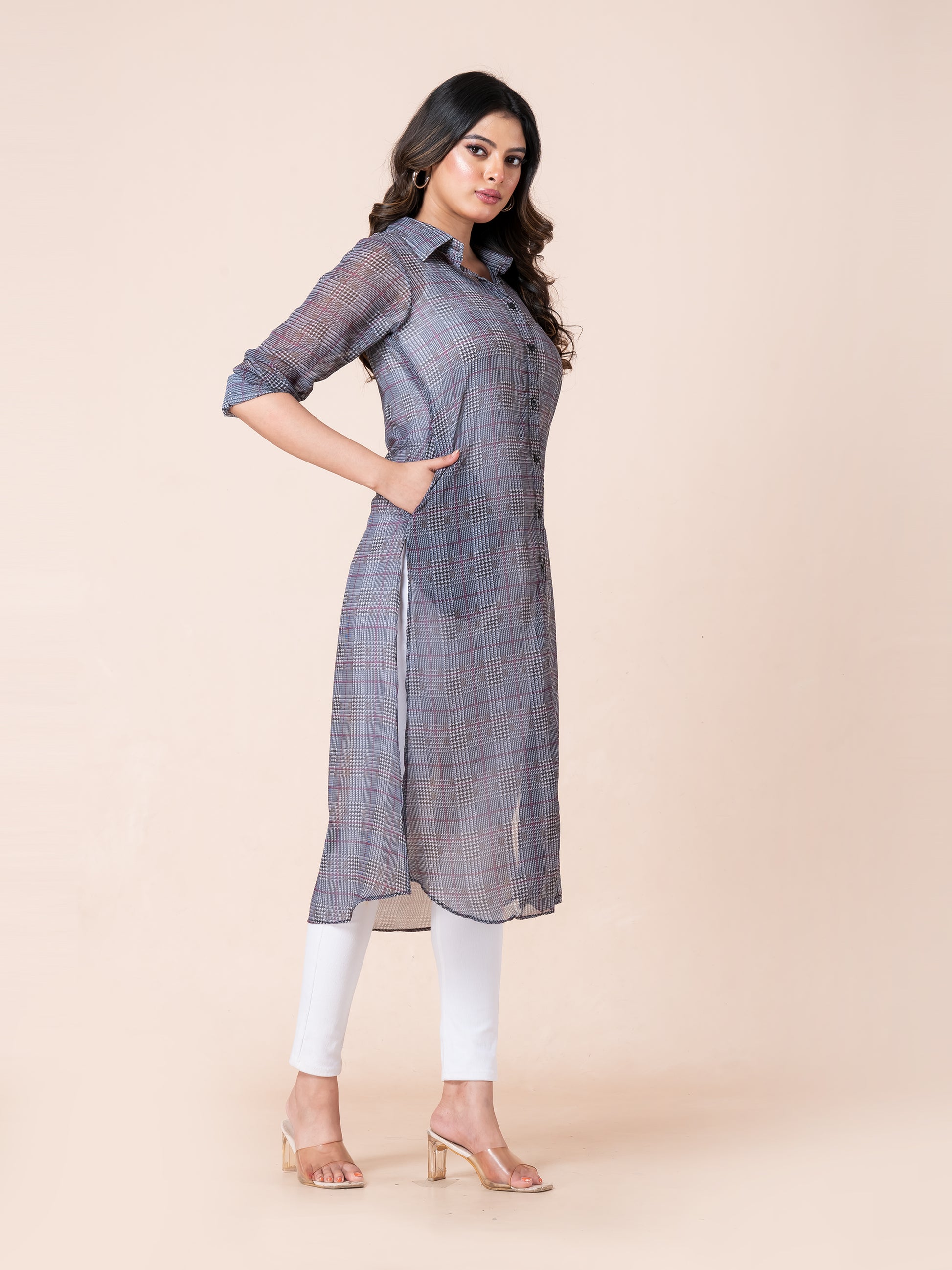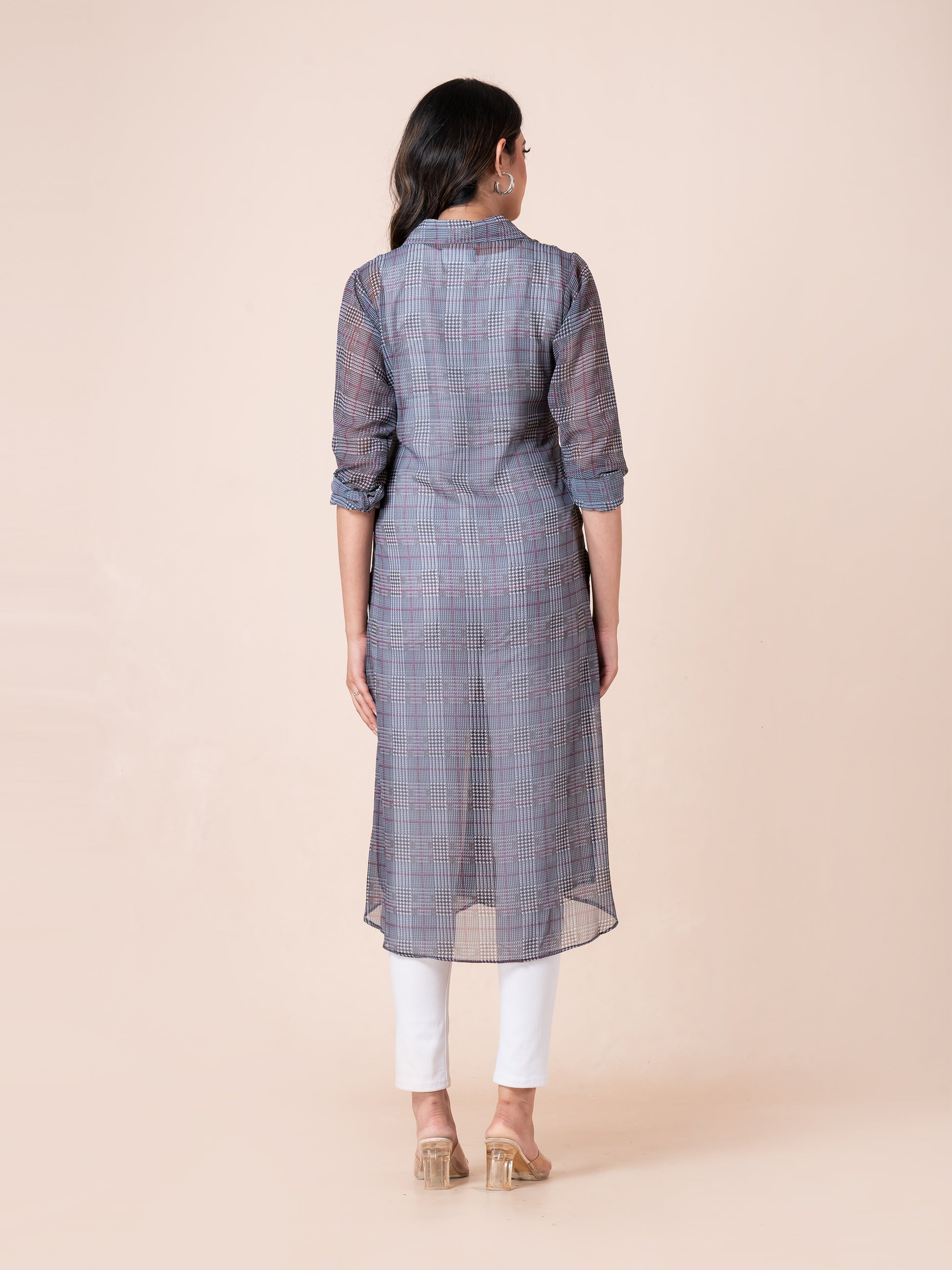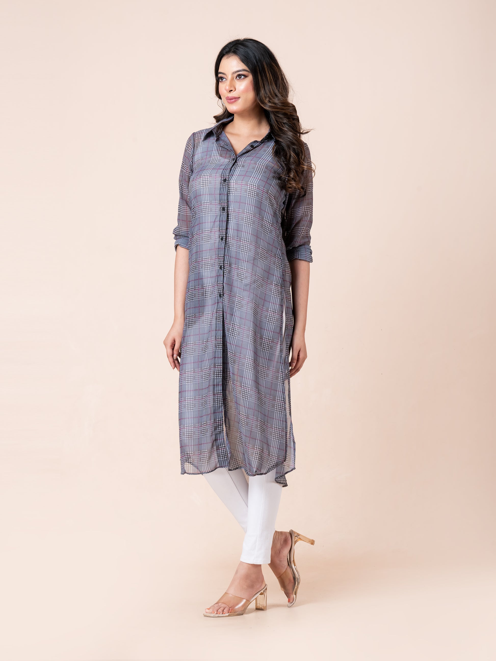 Step into effortless style with our Tiny Strips Glen Checks Digital Printed Long Shirt. Designed to make you look smart and stylish, this long shirt features a modern glen checks pattern with subtle striping for a refined, digital-printed finish. Crafted from a lightweight, semi-sheer fabric, it offers a breezy, elegant silhouette that’s perfect for layering. Whether you're heading to work or enjoying a casual day out, this shirt adds a touch of class and confidence to your look.